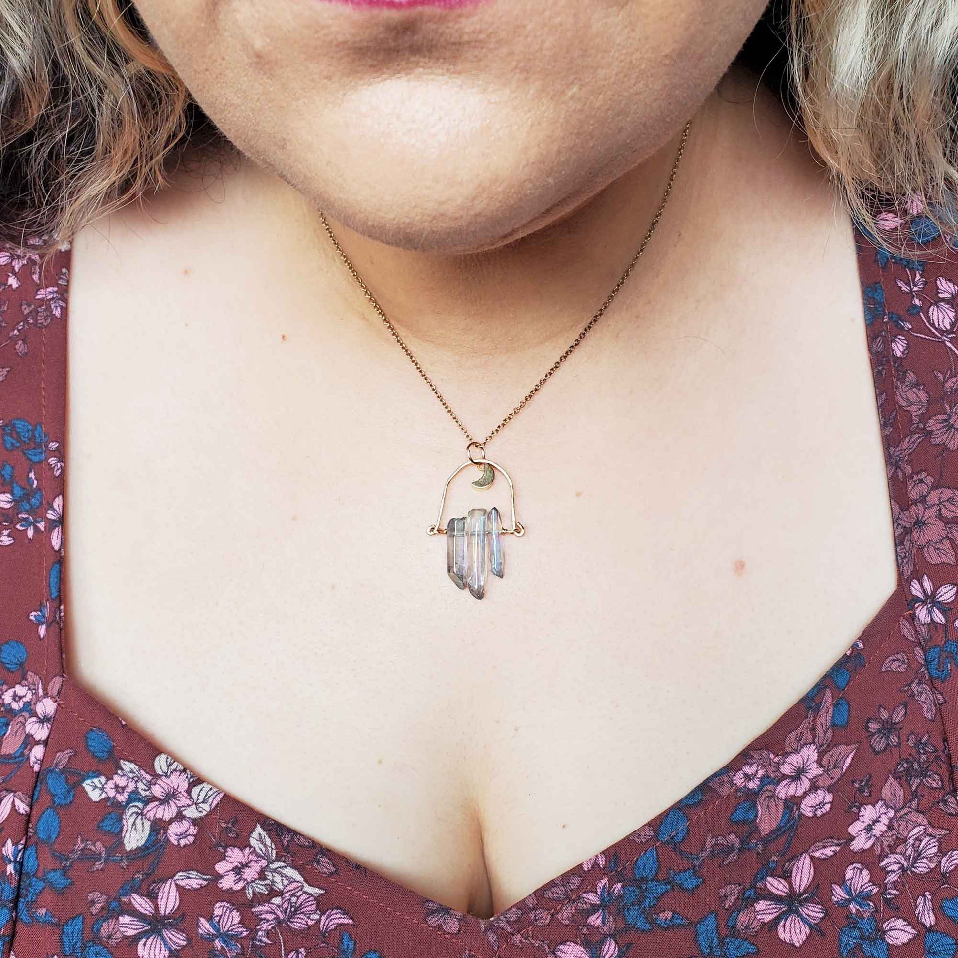 Featuring multiple shards of AB luster quartz—a crystal treated to refract a full aurora of shimmering color—this piece catches every hue from peachy pink to ocean blue, depending on the light. The fan-style arrangement and golden arc setting make it feel like starlight fanning outward from your heart.