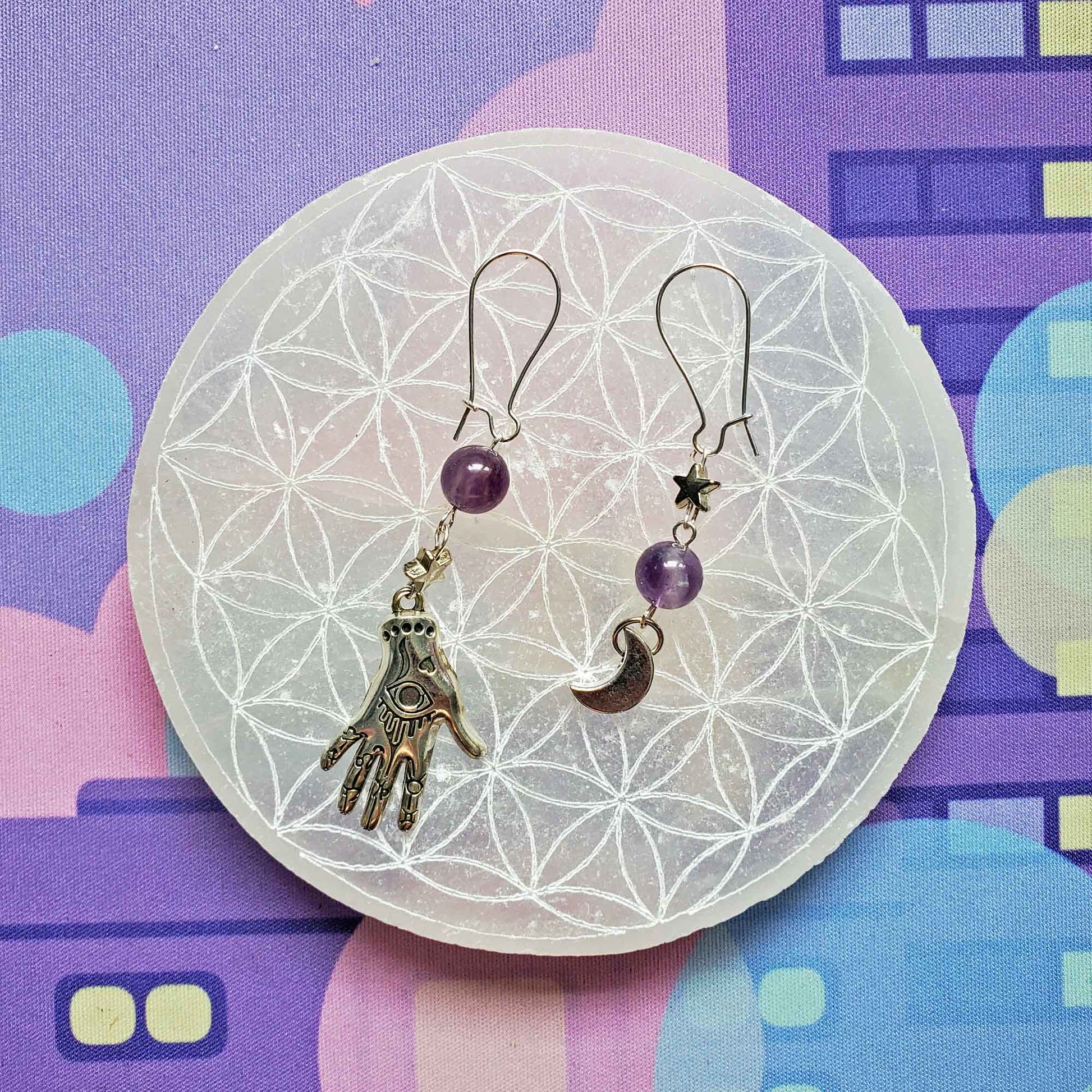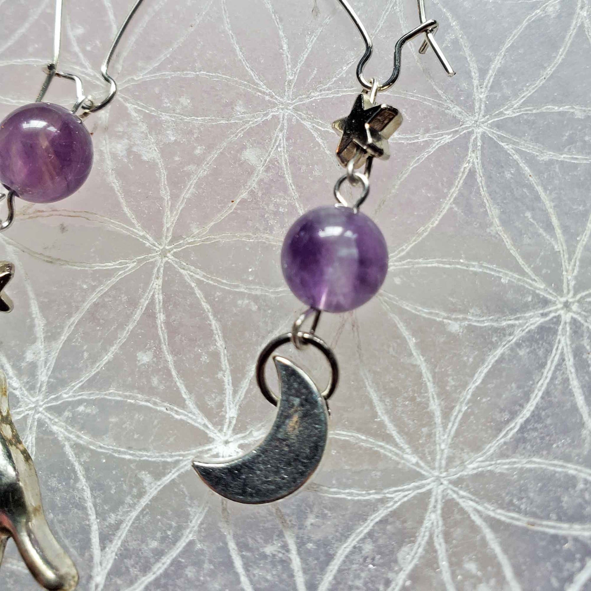 These earrings are an ode to Rhysand—the High Lord of the Night Court, the protector of dreams, the keeper of strength cloaked in softness. Featuring amethyst beads for psychic clarity and emotional resilience, this mismatched pair is intentionally enchanted.