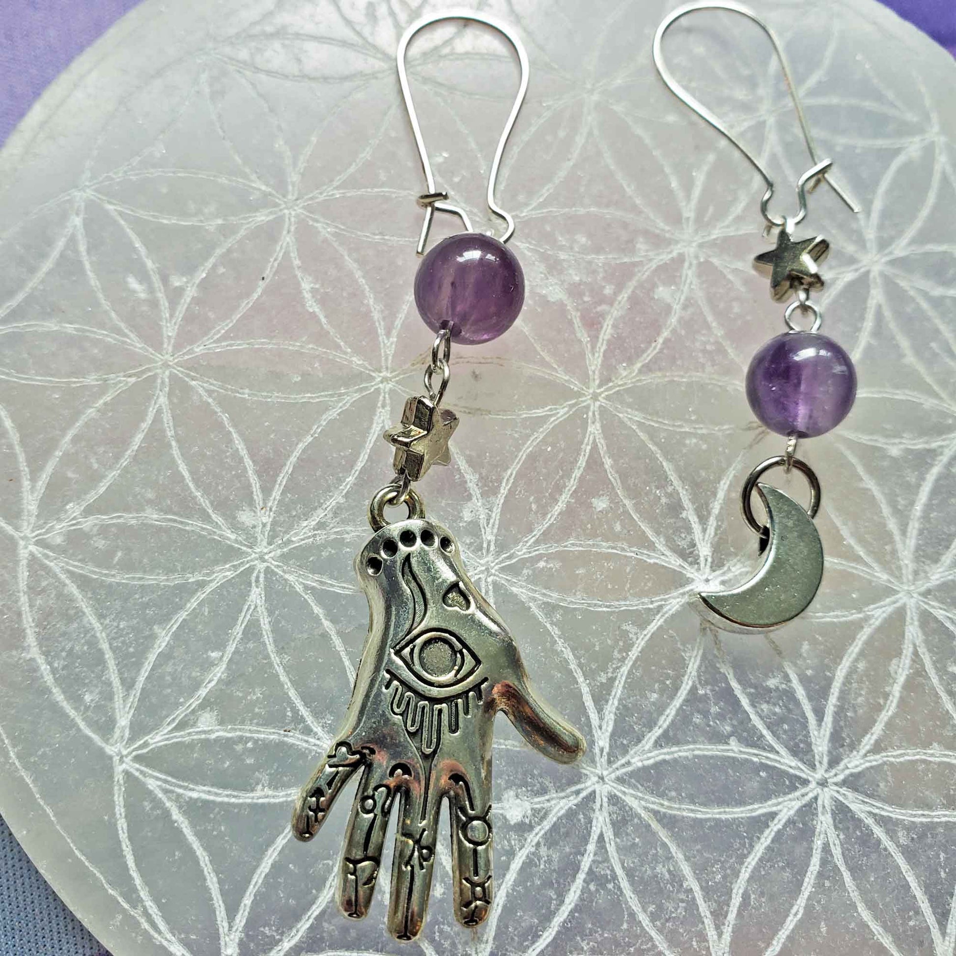 One earring holds a crescent moon—symbol of divine feminine cycles and cosmic intuition. The other, an open palm charm adorned with the all-seeing eye, woven in ancient protection.