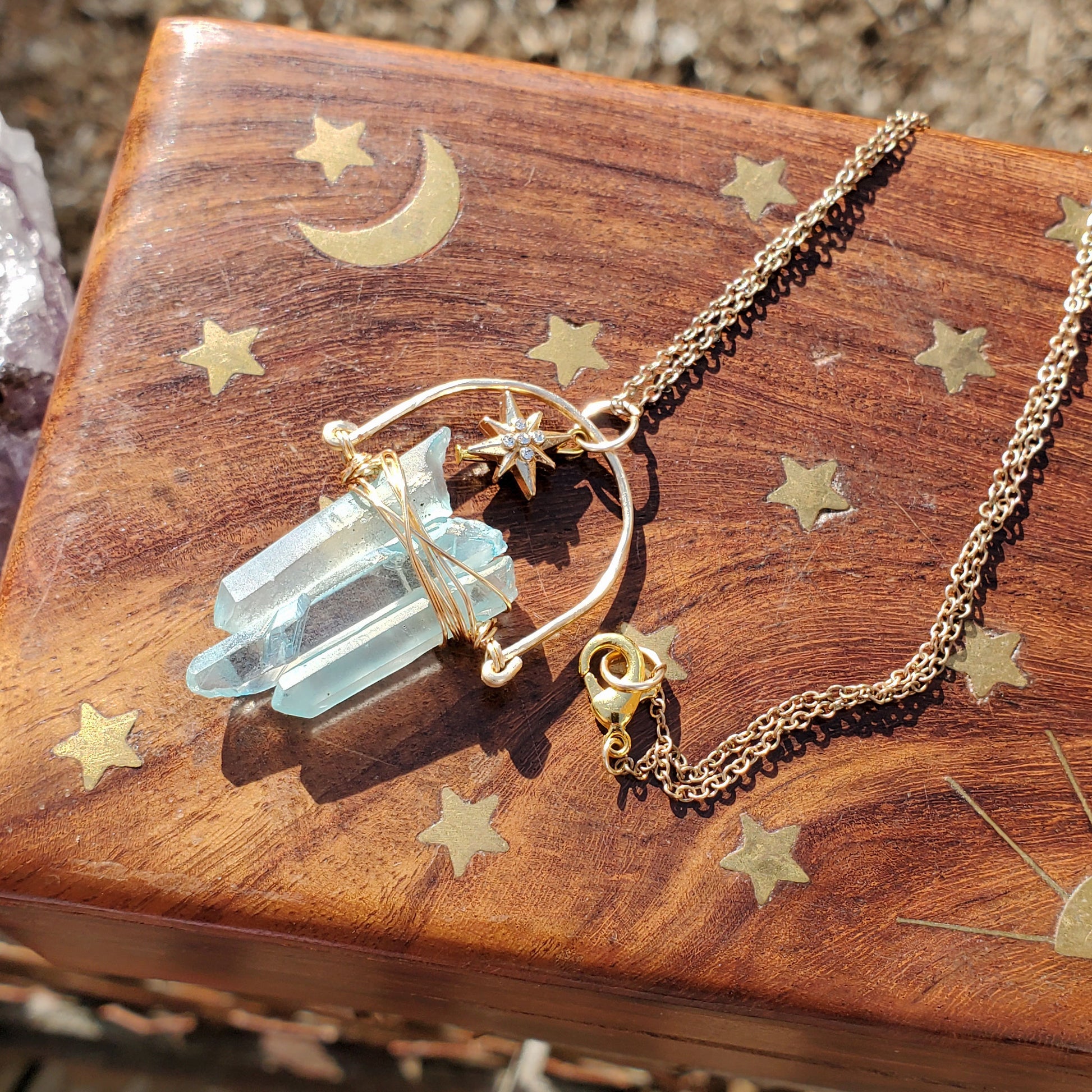 Made with three drops of blue pastel quartz—softly luminous and sky-touched—it carries the essence of tranquility, heart-centered communication, and peaceful emotional expression. These calming stones are suspended beneath a golden star, forming a constellation for the soul.